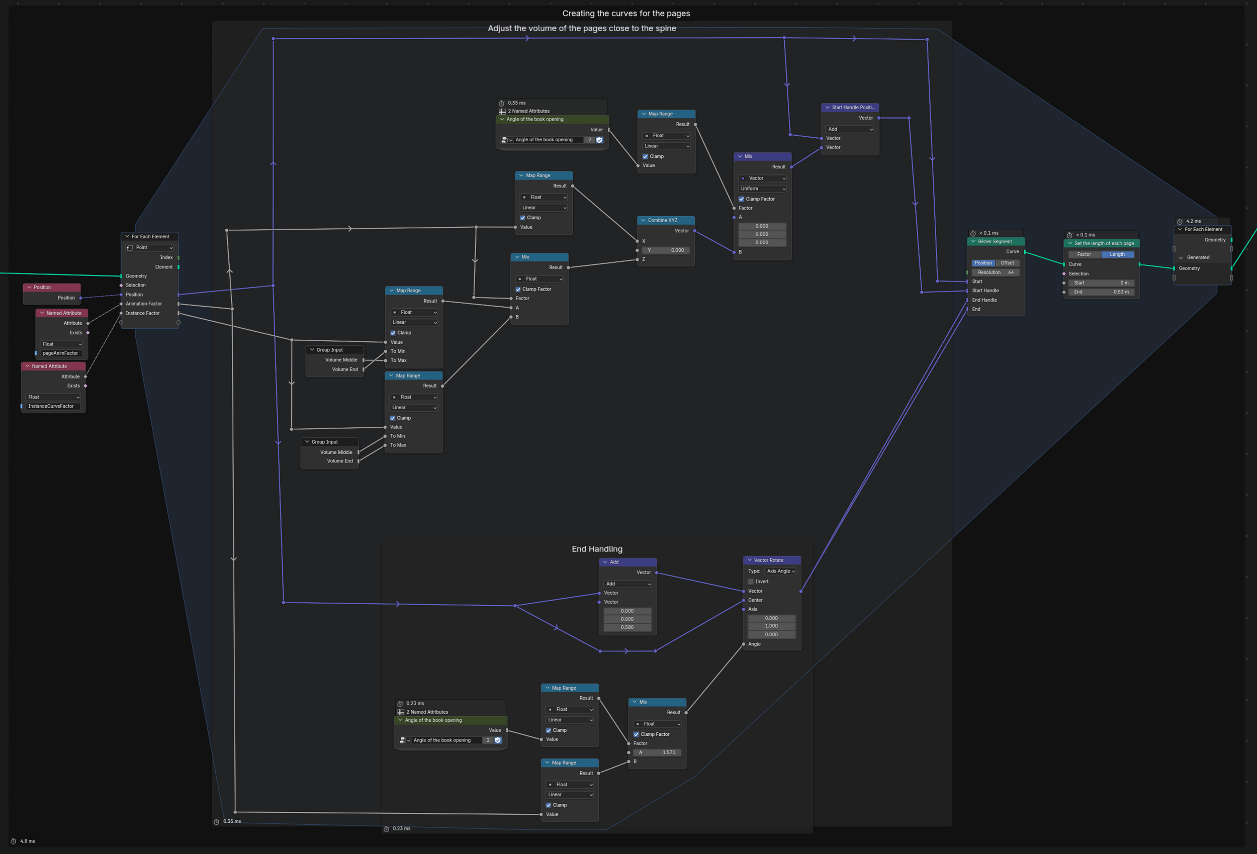 I came up with the solution using Blender’s geometry node system. I set it up so that it the system knows how much the book has been opened, along with controls to manipulate the user defined curves.